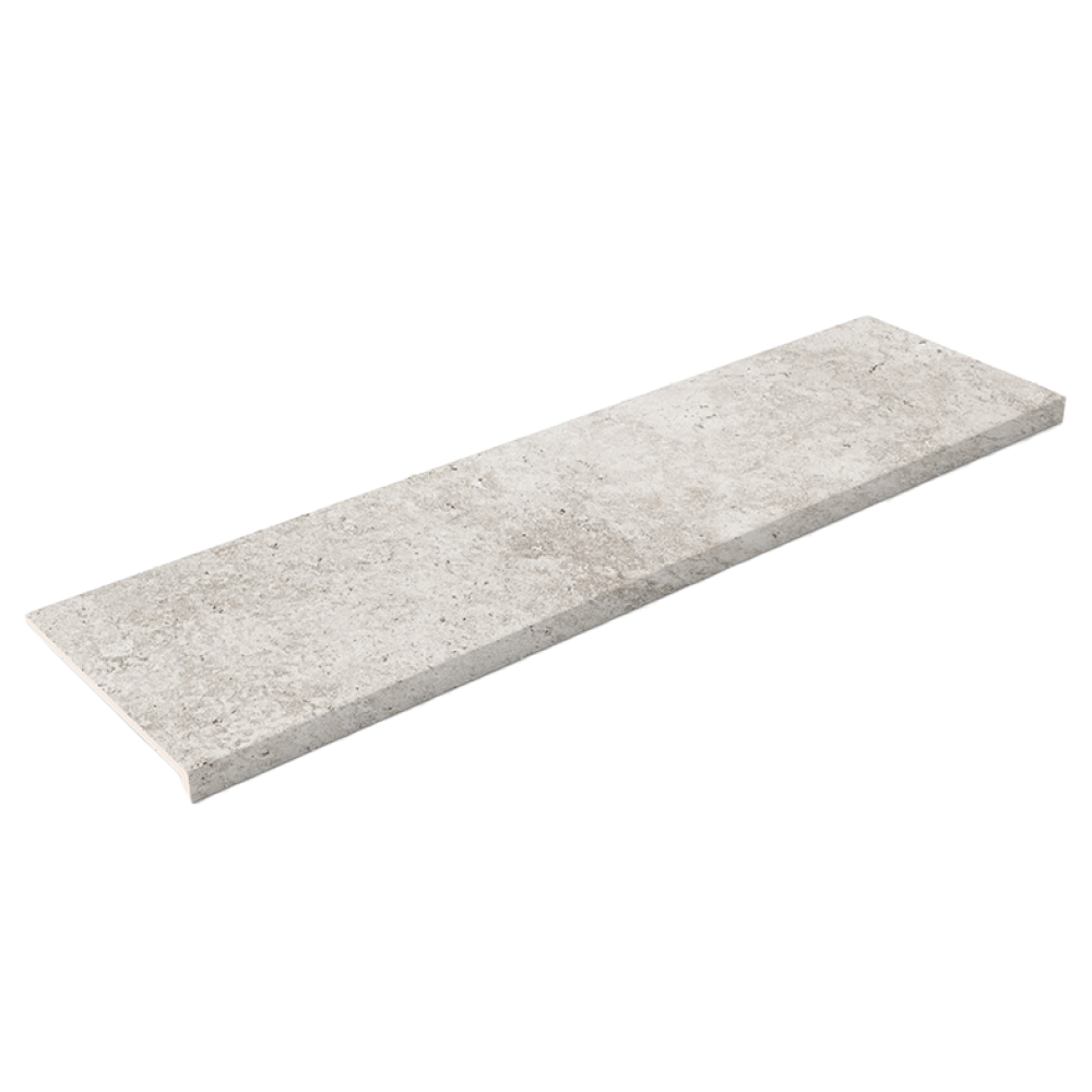 Серебристая фронтальная ступень из коллекции Crosscut привносит в пространство стиль и элегантность. Эта ступень имитирует поперечный срез травертина, предлагая уникальный визуальный эффект с пористой текстурой и естественными полостями, что делает её идеальным решением для современных интерьеров.