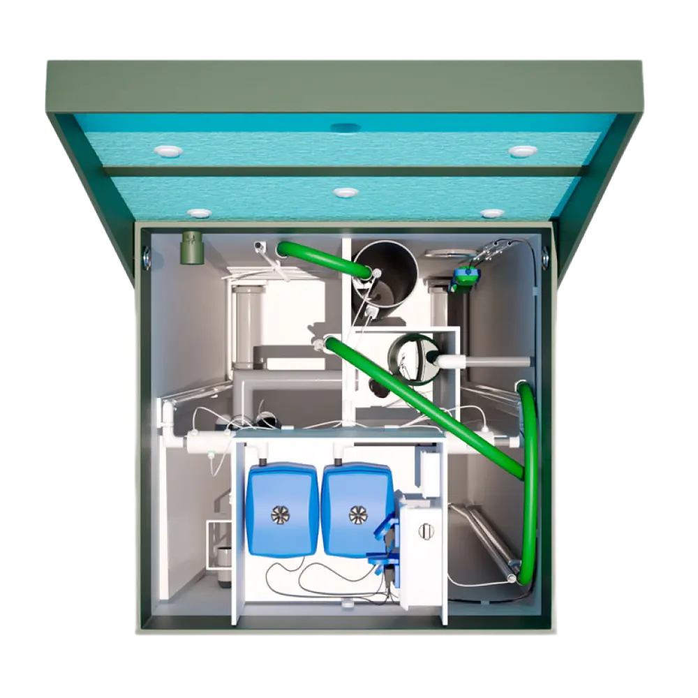 Станция предназначена для очистки стоков на объекте на 12 человек, расположенном на сложных грунтах: торфяниках, плывунах, участках с высокой степенью пучения. Усиленный корпус выдерживает значительные механические нагрузки, а удлиненная форма позволяет установить станцию глубже, избегая сезонных подвижек грунта.