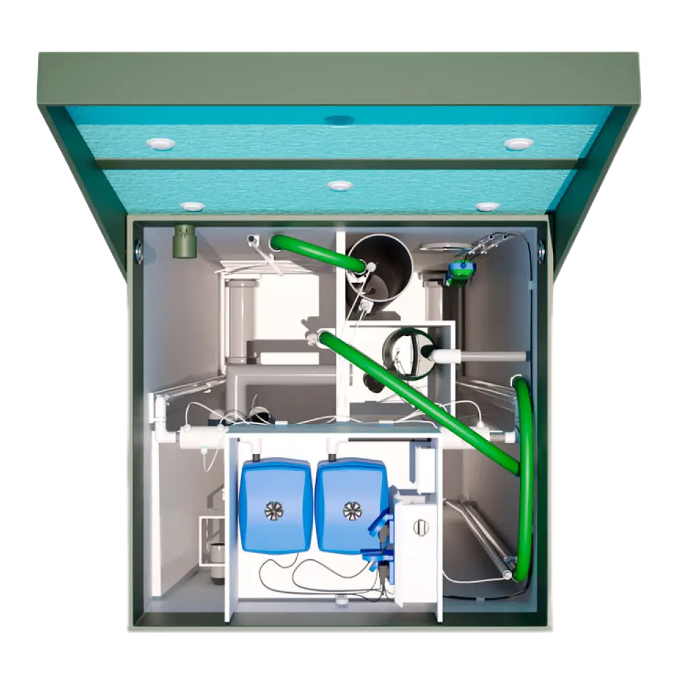 Станция предназначена для очистки стоков в частном доме на 5 человек, но с возможностью принудительного отвода воды вверх — в дренажный колодец, канаву, на рельеф или в общую ливневую систему. Это делает ее универсальным решением для любых участков, где стандартная станция не подходит по гидравлическим условиям.