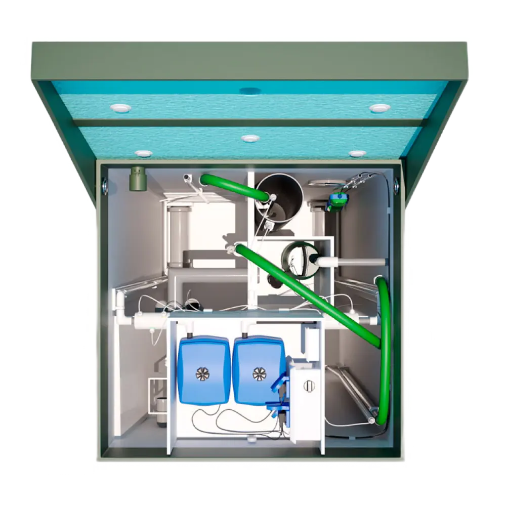Станция создана для больших загородных домов на 8 человек, расположенных на «проблемных» участках, где стандартные решения не работают. Она устойчива к давлению грунта, устанавливается глубоко и может отводить воду вверх — в любую точку ландшафта.