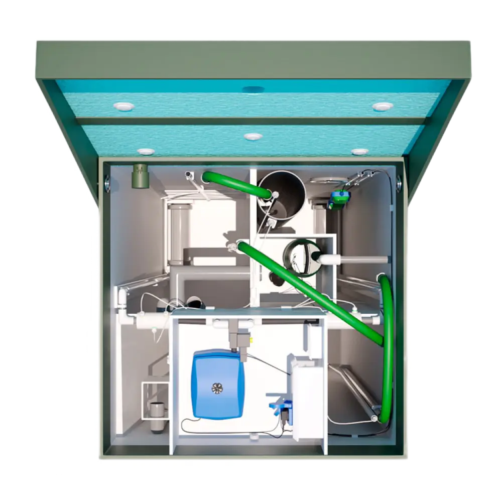 Для дома на 10 человек, расположенного в условиях, когда стандартные модели неэффективны — высокий УГВ, склон, низкая точка установки. Позволяет установить станцию глубоко и отводить воду вверх.