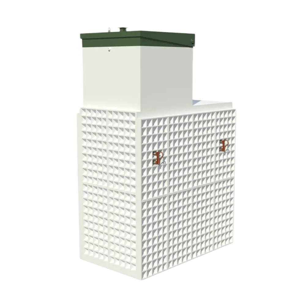 Для дома на 10 человек, расположенного в экстремальных условиях — высокий УГВ, подвижные грунты, сложный рельеф. Позволяет установить станцию глубоко и отводить воду вверх.
