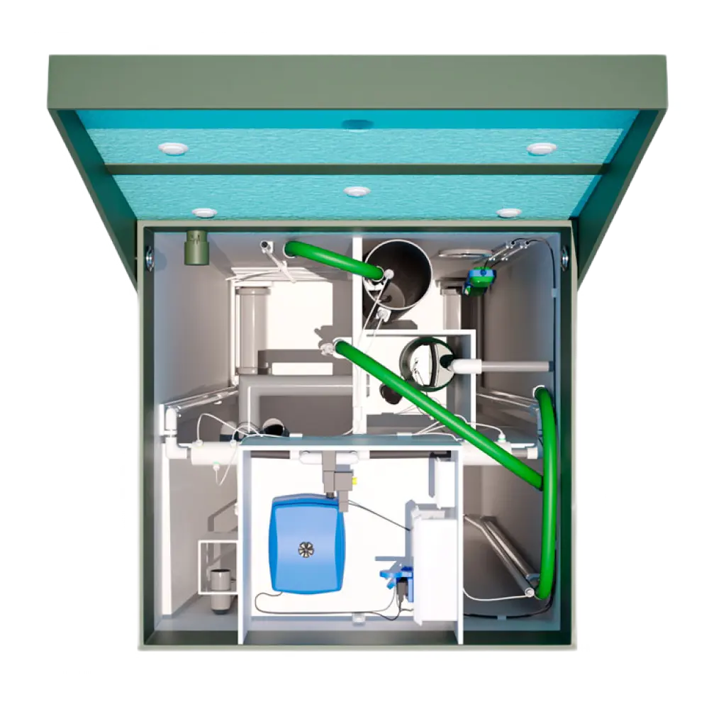 Для дома на 9 человек, расположенного в условиях, когда стандартные модели неэффективны — высокий УГВ, склон, низкая точка установки. Позволяет установить станцию глубоко и отводить воду вверх.